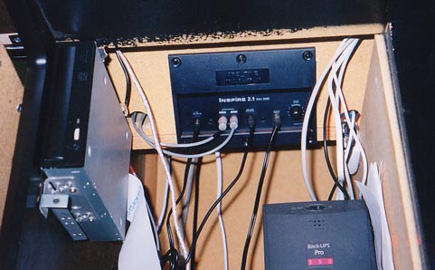 The larger subwoofer really creates chest-thumping sound (especially since it's mounted right in front of the player's chest!) It makes a world of difference in the game experience. I was genuinely surprised at how important good, strong bass is when playing games. An Interior Shot. Here is the heart of the MAMEframe. Right now the cabling is a bunch of spaghetti, but I do plan on cleaning things up and routing/bundling the cables a bit. The “@Power Strip” that is in the unit was a great little item that used to be available from Cyberguys — it senses when the computer is turned on, and then turns on all the other outlets on the powerstrip. When the computer is turned off, it turns off the other outlets in the MAMEframe, which is great for the speakers and marquee light. Unfortunately, it seems that Cyberguys is no longer carrying the @Power Strip. Andrew Lattof (Acey) on alt.games.mame found an alternative power strip: > I also was looking for this power strip for the MAME cab I'm putting > together, but had no luck in finding it anywhere. The manufacturer > for the @Power Strip is http://www.superturn.com.tw but their site is > mostly in Chinese and from my time spent there I can't find any place > to buy it from them. > > However, I found what looks to be a nice alternative in the Bits Ltd > Smart Strip : http://www.bitsltd.net/smartstrip.html You can read his review of the SmartStrip here. This is an interior shot showing the CD-RW mounting and the amplifier section of the Creative Inspire 2.1 speakers. The amplifier unit was removed from the original subwoofer wooden “cube” and mounted into the bottom of the speaker section of the cabinet. The CD-RW drive is mounted vertically on the left side of the main access door for easy access from the front:
