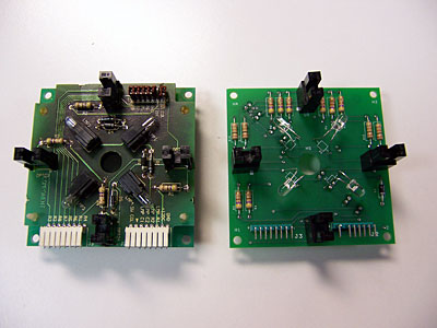 There is another clock replacement board on the market, sold by The Pinball Lizard. I chose the Rottendog board because it was a single-board design (the PinLiz design is two boards like the original) and the Rottendog version was $40 cheaper ($80 vs. $120). The other main difference is that the Pinball Lizard board uses SMT (surface mount) LEDS instead of the generic ultrabright LED's used by the Rottendog board. Comparing the original board to the new board you can see the simplicity in the Rottendog design (remember, from an engineer's viewpoint simpler is always better!)