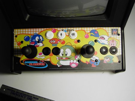 Tabletop on a Tabletop From an art standpoint, the cabinet seems to bring back the feel of the arcade with bright and colorful sideart. The Taito cabinet’s art primarily consists of the Bubble Bobble characters, for example, while the SNK NEOGEO cabinet shows off characters from Metal Slug and Samurai Shodown. The marquee area contains similar artwork, but it should be noted that it is not behind Plexiglas and it does not light up. A single mono speaker is centered underneath the marquee area. The joysticks are mounted with standard black-finished carriage bolts and dust washers. Unfortunately, there are four wood screws that mount the control panel to the rest of the cabinet. These don’t necessarily detract from the overall appearance of the cabinet, however they are noticeable. Considering the size of this bartop cabinet, I’m not certain how else it could have been done. Taito Control