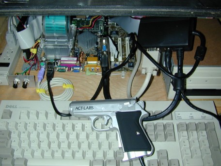 Compatibility As with the older model, the newer gun requires a PC with a Windows 98SE, ME, 2000, or XP operating system. There is still no support for LCD/TFT displays and the controller requires a VGA monitor. It does now support a higher resolution of 2048 x 1940 which is a step up from the previous model's limit of 1600x1200. This model too has support for 3D cards. While the previous model did not officially support two guns, Kevin did note that he had seen it done with MAME Analog+ and Windows 98. If you do not want to try this trick, Act-Labs does offer a gun that has been enabled for two-player support. You will need one normal USB PC gun and one "Dual 2-Player Enabled PC USB Light Gun" in order to take advantage of this new feature. We did not test this so we will have to take it on faith from Act-Labs. The test bed used in the review There is also a TV-Out version available for those who game on the boob tube. Again this is a separate gun so you need to make sure you know what display you will be using before you order. Kevin reported limited light game game support for the previous model in 2003, but it would appear that this has changed since that time. On the Act-Labs site, I found a listing of over 100 PC compatible games, though I only tested this unit in Mame32.