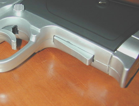 First Impressions At this point I really need to note that the review unit used in this article was provided by Rick Baretto at Dream Authentics. While the pistol and other hardware provided by Rick will be the same that you will get if ordering from Act-Labs, it is possible that there will be some differences in what is shipped with the gun and how it is packaged. The gun as shipped from Dream Authentics The pistol was shipped in a plastic tray which contained all of the controller components and connectors as well as a three page (two-sided) instructional manual. Sneak Peek: Check out the manual in a download available from Act-Labs As I am not very familiar with various types of actual pistols, I asked the good folks at Build Your Own Arcade Controls what real gun the Act Labs controller was modeled after. After a few false starts, the answer became clear and it is fairly obvious that the newer design is based on none other than the trusty Walther PPK sported by English Secret Agent, James Bond. Thanks to Markvp at BYOAC for the help! 007's weapon of choice - The Walther PPK Like its ray-gun predecessor, this model has a silver and black color scheme, though the grip is plastic rather than a rubberized material. It is very lightweight, coming in at about 0.24 Lbs, and 0.58 Lbs if you factor in the full weight of the cord. As reported by Kevin on the previous model, this one to has some plastic "creak." If you grip the unit tightly or apply pressure to any area of the gun, there is a noticeable creaking which detracts a bit from the fantasy of bearing a true weapon. Under normal game play this is not noticeable. The trigger on this unit emulates a left-mouse click and the hammer emulates a right-mouse click. This is called the reload button in the documentation. There is another small black button on the right side of the gun that is connected to the "hammer reload" function. In all you have two inputs available. The hammer "reload button" and the calibration lever I did not like the feel of the small black button on the right side of the gun as it has a very small diameter and profile making it hard to press repeatedly. It feels and looks as though some finished button top was not added. The small black "reload button" above the trigger There is also a button located on the front of the gun's grip that sadly appears to be glued solid. It would have been nice if this were operational and provided a third input to map for games like Turkey Shoot in which you need more than two (fire, grenade, gobble). The grip button that sadly is glued in place Lastly you have a calibration lever (pictured above) that is located on the left side of the gun. Pushing this down engages the calibration routine and pushing it back up resumes normal display and game play. More on this below. As mentioned above the gun came with a three page instructional pamphlet that is easy to read and very straight forward. No complaints there at all.