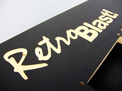 One of the surprises Scott at MAMERoom had for me was an "engraved" RetroBlast logo on the top of the panel. The engraving was just deep enough to route out the formica overlay, revealing the MDF below. It's a neat trick, and shows the precision and versatility of the equipment used to create the panel. (Note that this type of engraving is not something you can add to a panel using the design software, although it might be added at a later date.)