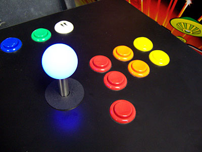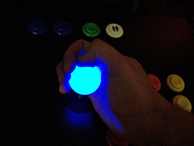 The balltop on these sticks feels different from any other joystick I've used. Whether it's the frosted surface or just the plastic used, they have a unique tactile signature, including something that I never thought I'd comment about when discussing joysticks: the temperature. The LEDs contribute a very small bit of warmth to the plastic, almost like it's been "pre-warmed" by another player. The stick is not hot, nor even warm, but just a tad above room temperature. Whatever it is, it's just one more reminder that this is like no other joystick you've ever used. I do wonder if the frosted surface of the balltops will wear with use, and what that will do to the appearance. The plastic is opaque, so you won't end up with a bright light shooting out of a wear spot, but I'll have to report back in six months on how the plastic surface deals with being held in a "Robotron Death Grip™". That Weird Glow... I've got to come back to the lighting on these sticks. I've talked to Christian at SlikStik, and he's mentioned that they take several steps during the manufacturing to ensure that the light from the LEDs is evenly diffused throughout the balltop. Whatever they're doing, it works. The light is amazingly even from these sticks — in fact, the only variation visible is right at the base of the joysticks, something you'll never see unless you're at eye level with the control panel.