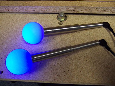 If installed correctly, the addition of the power cord to the shaft is imperceptible during gameplay: the joysticks felt every bit as responsive and quick as the normal P360 shafts or the SlikStik aluminum ball-top shafts. First Impressions My first impressions of these sticks when lit up? Eerie. Honestly, the glow from these balls is a little unsettling at first: it's so even and indirect that it doesn't seem to be a natural light source (and considering how hard it was for me to get good photos of these sticks, I'm beginning to wonder if they really aren't tapping into otherworldly energy sources!)