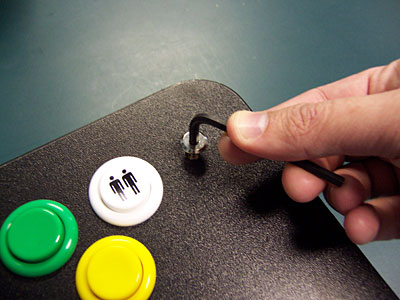 Inside the Stinger There's one more of those "cab-friendly" design decisions visible on the top of the panel, namely the chrome hex-head screws that hold the top panel in place. These screws can be easily removed using the included hex key, and once they're out the entire top panel just lifts off. With this mounting system there's no need to completely remove the control panel from a cab just to get inside the panel.