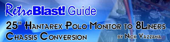 Part 1: Getting Started and Removing the Old Hanatrex Chassis Introduction Got a broken arcade monitor? Maybe you're just tired of searching for a decent-looking display and don't have the dough to shell out for a new (and extremely heavy) Betson Imperial or Wells-Gardner D9200. If you already have monitor with minimal burn-in, you can save a ton of money by simply replacing the chassis (monitor guts) instead of buying a whole new display. The following article will outline the steps involved in replacing the chassis of a 25” Hantarex Polo arcade monitor, with a new one from 8liners. 'Polos are a common display found in many Midway and Capcom cabinets, including the Mortal Kombat, Killer Instinct, NFL Blitz, and Street Fighter line of games. The one used here was removed from a non-working MK 3 cab and was determined to be the perfect candidate for an 8liner swap due to a very crispy chassis that needed more than just a few capacitors replaced! This tutorial should give you an idea as to the level of difficulty and skill involved in making such an installation. If you have a moderate understanding of electronics and are relatively handy, this just might be the project for you. In addition, if you have a larger or smaller display than what I used, many (if not all) of the steps can be used as a guideline in replacing a different chassis than the one I used. Just email the folks at 8liners.com and see if they have any tips or suggestions. It should be fairly simple for them to determine which replacement board is right for your tube and what additional measures (if necessary) will be needed. Here are the specs of the 8Liners board I used: Specifications :