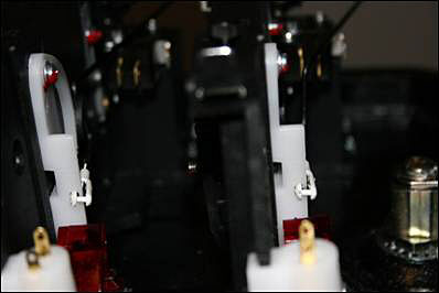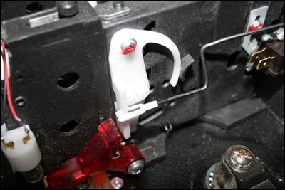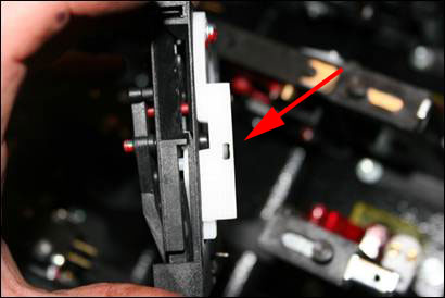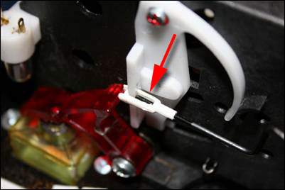 Using a Dremel tool with a small cutting bit, route out a grove in the top edge of each eject button swing arm (white plastic piece). The position is based on trial and error, the placement of the pictured hole was the location that seemed to provide a significant amount of throw but not so much as to push the bottom ball link off the switch wire. Before cutting this hole study the mechanical action of the switch.