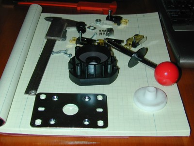 Mag-Stick disassembled The existing panel, featuring a multi-williams layout, originally housed WICO 8-way, leaf-switch joysticks. The Ultimarc Mag-Stiks I intended to use came with joystick mounting plates that were not the same size as the WICO plates and I was faced with the decision to either re-drill my existing panel (and redo the artwork and redo the plexiglass overlay) or make new mounting plates for the Ultimarc upgrades.