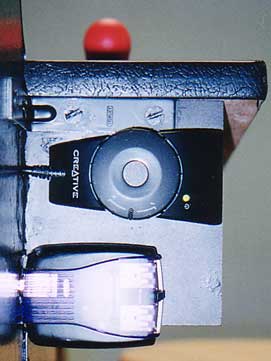The larger subwoofer really creates chest-thumping sound (especially since it's mounted right in front of the player's chest!) It makes a world of difference in the game experience. I was genuinely surprised at how important good, strong bass is when playing games. An Interior Shot. Here is the heart of the MAMEframe. Right now the cabling is a bunch of spaghetti, but I do plan on cleaning things up and routing/bundling the cables a bit. The “@Power Strip” that is in the unit was a great little item that used to be available from Cyberguys — it senses when the computer is turned on, and then turns on all the other outlets on the powerstrip. When the computer is turned off, it turns off the other outlets in the MAMEframe, which is great for the speakers and marquee light. Unfortunately, it seems that Cyberguys is no longer carrying the @Power Strip. Andrew Lattof (Acey) on alt.games.mame found an alternative power strip: > I also was looking for this power strip for the MAME cab I'm putting > together, but had no luck in finding it anywhere. The manufacturer > for the @Power Strip is http://www.superturn.com.tw but their site is > mostly in Chinese and from my time spent there I can't find any place > to buy it from them. > > However, I found what looks to be a nice alternative in the Bits Ltd > Smart Strip : http://www.bitsltd.net/smartstrip.html You can read his review of the SmartStrip here. This is an interior shot showing the CD-RW mounting and the amplifier section of the Creative Inspire 2.1 speakers. The amplifier unit was removed from the original subwoofer wooden “cube” and mounted into the bottom of the speaker section of the cabinet. The CD-RW drive is mounted vertically on the left side of the main access door for easy access from the front: