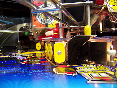 Click here to launch the video in a separate window The adjuster sells for $7.99 from Tom Wible, which seems a bit high for a piece of metal, although I do agree the sandblasted texture looks nice and it does make the mod look a bit more "factory original." Mini-Playfield Custom Lamp Mod The "street lamp" over the "Power" mini-playfield is a pretty drab affair: not only is it non-descript looking, it also blocks the view of the gumball and in general feels like it was a design afterthought. Is there a mod to address this? Of course there is — this is the Twilight Zone, after all, where anything can happen. Enter the custom lamp mod from David F. Kvasnicka, aka "Yelobird1" on eBay: