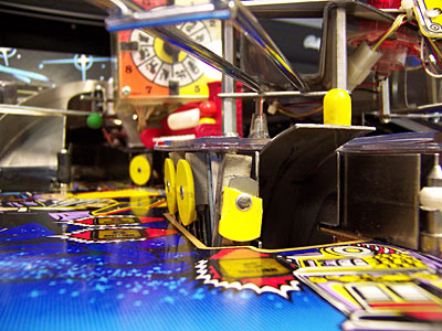 This mod took a bit more time to complete than some of the others, mainly because of the incredibly awkward work environment: to staple and solder the new sockets in, I had to either lean completely over the pin from the right side of the pin, or "limbo" under the light door from the left side. Either way, it was a royal pain, but luckily there were only six sockets to replace. The sockets cost about $.89 each, so for about $5.34 + $7 for a box of 455 lamps, plus some sweat, swearing, and soldering iron burns, you can add blinky lights back to your Twilight Zone backbox (and I'll do anything for blinky lights...) Another area of concern on the Twilight Zone playfield is the "greed" target located right next to the slot machine scoop. Because it's so close to the flippers this target takes an enormous beating, and it just wasn't designed to handle the abuse. Worse, as the target gets bent back from all the high-speed impacts, it pulls back and exposes the edge of the scoop assembly to ball hits, which will in time break the welded joints on the scoop. In addition, a bent target can lead to increased airballs, which are never a good thing in a pinball machine.
