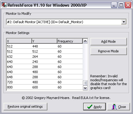 Note: If you do somehow mess up and set the display to a resolution your monitor cannot handle, quickly shut things down (pull the plug if you have to!) and then "Safe boot" into Windows (hold down the Shift key while booting or press F8 and select "Safe Boot" from the menu) and reset the monitor's settings to a safe resolution. XP Clean Install Note: If you are doing a "clean install" of Windows XP with the ArcadeVGA card, be aware that WindowsXP will force the display into 800x600 mode for the setup process. This shouldn't be a problem with either of the arcade monitors I've mentioned, but be aware that it could be a problem if you're using a monitor that cannot handle 800x600. In this case, you'd need to install Windows with another monitor, then switch over to the arcade monitor once XP was up and running. Windows Prep Work Once you've installed the AVGA card and Windows has installed the drivers, it's time to make sure that no one ever can accidentally set the display to a resolution or refresh rate that your monitor can't handle. Luckily, there is a very handy utility out there that can do just that. The utility is called RefreshForce, and you can use this utility to ensure that Windows "plays nice" with your arcade monitor.