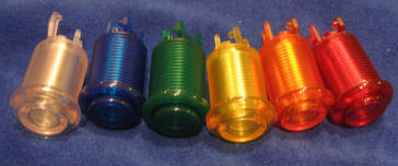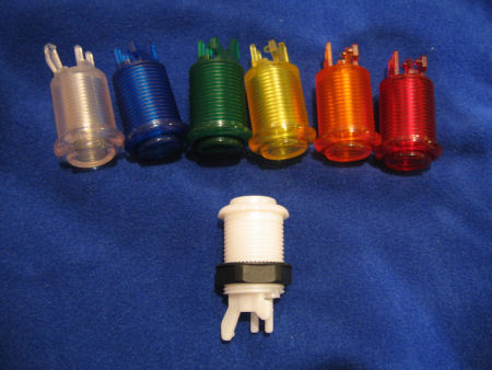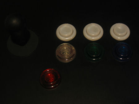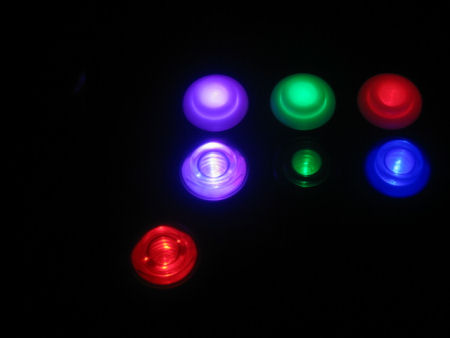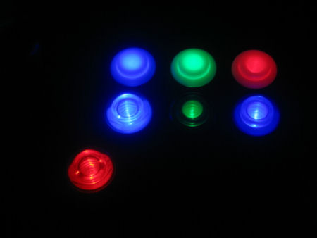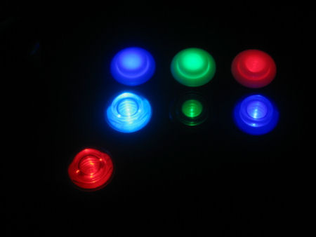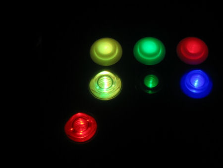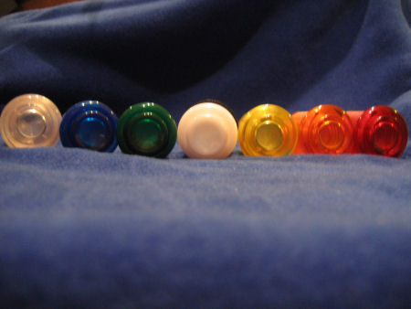 Wiring up LEDs, resistors and mounting them can be a pain. RGB LEDs are 3 times the pain. The GroovyGameGear RGB-Drive Pushbutton Lighting Module makes all that pain go away. Using this module, you can literally have LEDs installed and ready to go in minutes. The RGB-Drive comes in a few options: bare board, board with resistors and RGB LED installed for use with 5V power, and board with resistors and RGB LED installed for use with 5V power and a 24" 4-conductor cable. I opted for the package with everything including the cable. The board is very small and compact and fits the pushbuttons I used perfectly. The RGB LED’s are very versatile and can produce a variety of colors. You can hook up all three legs as RGB LEDs, or just one or two legs if you need a smaller variety of color. GGG describes the LED’s as Ultra-bright wide-angle LED’s, 5mm in size, draws 20 mA per color (60 ma total), and have high luminous flux levels. The only down side with the full package is the cable. The cable comes soldered to the RGB Module, but the gauge of wire is very small. The other side of the cable needs to be stripped and I had to go through a couple wire cutters to find one that supported that gauge. The other problem was using the cable with the LEDWIZ. If the cable is not aligned correctly it will slide right out of the screw terminals. GroovyGameGear Electric Ice Pushbuttons The GroovyGameGear Electric ICE Buttons are designed to use a bottom mount LED to the fullest. It comes predrilled to bottom mount a 5mm LED and easily mates with the RGB-Drive Pushbutton Module. The color is whitish with a kind of pearl like finish. At first I thought I might not be fond of the buttons while they were off, but they are really starting to grow on me and I think look really good. The button size and dimensions look to be the exact same as regular Happ Pushbuttons, but there is more play in between the plunger and the base then the Happ Pushbuttons. The material of the Pushbutton is also different then a standard pushbutton. Firing up a game and playing a few games I couldn't tell any difference then a regular pushbutton. The only difference I did notice was that if I pressed the button down and quickly release it while taking my finger off, the button rattled. Again, I didn't really notice this during game play. Where the Electric ICE Pushbuttons really shine are when lit up with LEDs. The Electric ICE Pushbuttons light up really well. The light is distributed very evenly across the whole button. With the lights of the Electric ICE Pushbuttons, the colors are very vibrant. With the lights on the color is very visible and uniform, but the color almost seems to be coming from the inside and you see the white on the outside. Happ Translucent Pushbuttons The Happ Translucent Buttons are just like the normal Happ Pushbuttons, but translucent. They come in a variety of colors: Clear, Yellow, Orange, Red, Blue and Green, but require a bit more work to light up. There are a variety of ways to light them up and I chose to bottom mount them the same way as the Electric ICE Pushbuttons. Bottom mounting the Happ Translucent Pushbuttons means you also get to whip out the Power Tools for a brief time. First I removed the plunger from the Pushbutton, then using a 3/16” drill bit and drilled away a hole in the bottom of the Pushbutton. Happ was nice enough to include a template on the bottom of the Pushbutton, so it’s pretty easy to drill and only takes a few seconds. Lighting up the Translucent Pushbuttons was a bit of a mixed bag. The green is a little dark compared to the other buttons. The LED’s I used were matched specifically for the Electric ICE Pushbuttons. The green really needed a stronger LED or multiple strategically placed LEDs. It illuminated, just not as well as the others. The blue and red were perfect and looked great. One thing to note is that using the RGB LED with the greed, red, and blue button is that if you use a color other then the color of the pushbutton it will have almost no effect. It's a weird effect and myself and others thought the LED was busted, but this is not the case. The clear also looked really good and when used with the RGB LED’s produced the variety of colors perfectly. The yellow and orange are a little lighter by nature and light up well. I did find the orange a bit harder to light up orange. It takes some a bit of trial and error or the button looks a bit red. One downside to using a variety of the Happ Translucent Pushbuttons is that the lighting is not equal for all buttons. This could lead to some being brighter then others. There is also some concern about bottom mounting LEDs in a translucent button. Basically, it can be really bright if you stare down the barrel of the button. I never experienced this during testing or game play and only experienced it if I purposely leaned over and stared down the barrel. Happ Pushbuttons What’s that you say? You can’t light up a regular pushbutton. I can and I did. I bottom mounted them the same way as the other buttons and gave them a shot. The buttons actually lit up fairly well. They didn’t illuminate like the other buttons, but you could tell they were lit and would work fine for indicating what buttons to use during game play. Comparison Shots The following shots and for reference so that you can seen all available Pushbutton unlit and lit with the RGB-Drive Pushbutton Lighting Module. Note: I turned the white balance down on my digital camera. I felt the cameras tend to show too much light and I felt this represented the shades of colors more like what you would physically see.