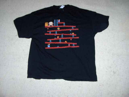 Full Size Donkey Kong Shirt Showing Large Print Indeed. These T-shirts are very cool. They are all 100% Pre-Shrunk Cotton, with large screen printing. I got three of them and have rigorously tested them in a number of gaming environments. I personally believe they have a mysterious score-enhancing quality, but this is still under investigation.