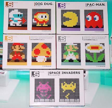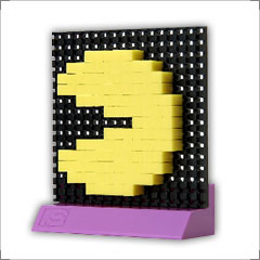 by Jonathan Imberi Tomytec, a Japanese toy company and an affiliate of Namco Limited, recently released a series of peg toys on which you can create video game characters in their pixilated form by using hundreds of pegs plugged into a board. (Remember Lite Brite? Same concept – without the light.) Kind of like Japanese Legos. There are five different kits (Mario, Pac-Man, Luigi, Space Invaders and Dig Dug) and each one includes a few hundred pegs of different colors and two pegboards with stands to create your designs on. Each pegboard (including its stand) is 74mm tall by 64mm wide. The boards can be joined together to create a bigger display area. I am sure you can guess which kit I ordered. Each set contains instructions for creating multiple characters. For example, my Pac-Man kit allows creation of Pac-Man, Blinky, A Blue (Edible) Ghost, The Cherries, The Apple, The Galaxian Ship, Pac-Man and Blinky (with the boards combined), The Strawberry, and The Key. And of course whatever else your imagination allows!