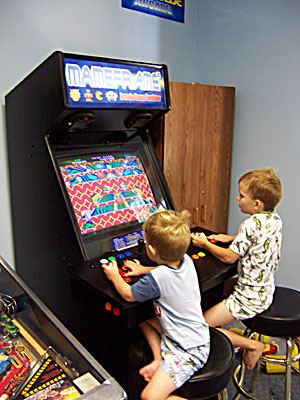 In all other test areas, the Betson monitor passed with flying colors (literally?). Images were sharp and well defined, contrast was excellent, and screen geometry was very good for an arcade monitor. The contrast was especially good on the Betson monitor. I had noticed a sort of "black glow" with the D9200 — the black areas of the screen changed color (from jet black to a light reddish-gray) depending on the amount of bright colors currently being shown on the display. There was no fluctuation, however, with the Betson monitor — blacks were black, no matter much of the screen had color on it. Speaking of color, color purity (where a screen of a single color does not appear uniform and even) was a potential issue (again, see the RetroBlast D9200 review for details). The Betson monitor showed no signs of color purity issues at all, at least until I installed the monitor. After installation into the cab, I noticed a slight color purity problem in the red test screen, in the upper-right hand corner. Monitors occasionally get slightly "magnetized" as they are moved from one spot to another, causing some slight purity problems, but these can be addressed by degaussing the monitor and/or just waiting a while for the effects to wear off. The small purity problem with the Betson tube is still there after a few degaussings, but I'll keep an eye on it and report back if it doesn't fade away after a week or so. Putting It All Together (Final Installation and Conclusions) The Betson proved itself to me with sharp, clear colors, great contrast, and a very clear 800x600 mode. The 800x600 mode is especially important for Windows XP-based cabs, since XP's default minimum resolution is 800x600. Add in an onscreen display with plenty of image adjustments and a quieter 15Khz/31Khz mode switch, and I was sold. All that remained was to swap out the D9200 monitor for the Betson. (Update: Add one more plus to the Betson column — the ACT-Labs light gun works perfectly with this monitor, so I can now have a light gun on my cab!) Arcade monitors in the same size range are all designed for common mounting. To replace the D9200 in my cab, I simply had to unbolt it, pull it out (with the help of a friend!), and place the Betson in its place. Everything fit exactly the same, and the mounting holes lined up perfectly. It only took 5 minutes, but it definitely requires two people!