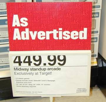 Is it Really That Bad? Many of the transgressions listed here could be forgiven. While a bit “delicate” for a real arcade cabinet, the unit’s construction could past muster for a home use game. The lack of an illuminated marquee can be excused as a needed cost-cutting measure. The artwork too can be looked at as an opportunity for an enterprising Photoshop user to perform “field upgrades.” What cannot be forgiven is the absolutely terrible quality of the joysticks and buttons of this offering. The layout too, for a cabinet featuring Midway (mostly originally Williams) games, is a mystery. A multi-Williams control panel layout would have gone a very long way towards improving the playability of Defender and Stargate and still provided all of the inputs needed for the remaining games. The display as well, especially considering the cost of a 19” color television monitor, is inexcusable. Coal in Your Stocking At a suggested retail price of $499.00 (there is also a tabletop unit for $299.00), and appearing near the holidays, this piece had the potential of being a real entry level option for aspiring retro gamers who may not have the time or skills to build their own or the available finances to purchase a more well made cabinet from any one of the many builders featured on these pages. Instead, Big Electronic Games has simply thrown together an absolute piece of rubbish and tossed it into the market in time for the holidays in a blatant attempt to capitalize off of the recent nostalgia surrounding classic arcade games. Their attempt to break into the retrogaming market with this offering is just shameful. Frankly that shame is shared by Midway for allowing their games to be featured on this platform and by Target as well as other stores, for attempting to pass this off on their customers.