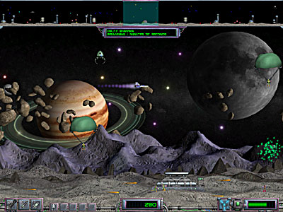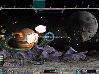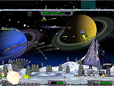 The creator of this game, Tony Zurovec, has not only captured the frenzied action and game play of Defender and Stargate, but along with artist Matt Sheffield, has added object and scenery visuals that truly enhance the destructive experience without sacrificing game play for dizzying polygons and unneeded 3d cinematic. The Guardian patrols over crisp, well rendered backdrops such as a foreboding alien moonscape with tumbling asteroids orbiting the scenery, gently falling snow in a winter killing field, and scenes of fiery eruptions and magma plains the likes of which may have been seen in Dante’s worst nightmares. The sound in Zurovec’s creation is frenzied and adds much to the experience. From the satisfying thud of enemies impacting the surface to the crackle of laser fire the sound in this game does not disappoint. At times the explosions begin to merge into a single grumbling roar as you wade through the attacking horde. For the sicko in you, listen carefully for the screams of colonists and others on the surface when they meet an untimely end. True to its prototypes, the game sports familiar sound effects when enemy ships teleport to the battle and subtle audio warnings when colonists are being snatched from the surface.