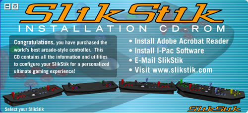 Pop it into your computer, and you're presented with an installation screen that allows you to install an IPAC programming utility, read the 50-page SlikStik manual, and install the proper MAME configuration files for your SlikStik controller.