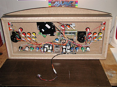 The SlikStik unit itself was heavy, solid, and large - nothing about this unit seems second-class. Measuring over 35" wide, it's not something you're going to want to plop in your lap for some quick retrogaming action. Constructed of ¾ inch high density particle board, the unit feels like a rock. The outer surfaces are covered in black formica, and the edge of the control panel is trimmed with plastic T-molding. The bottom panel of the SlikStik can be unscrewed for access to the interior, which features very clean wiring layout.
